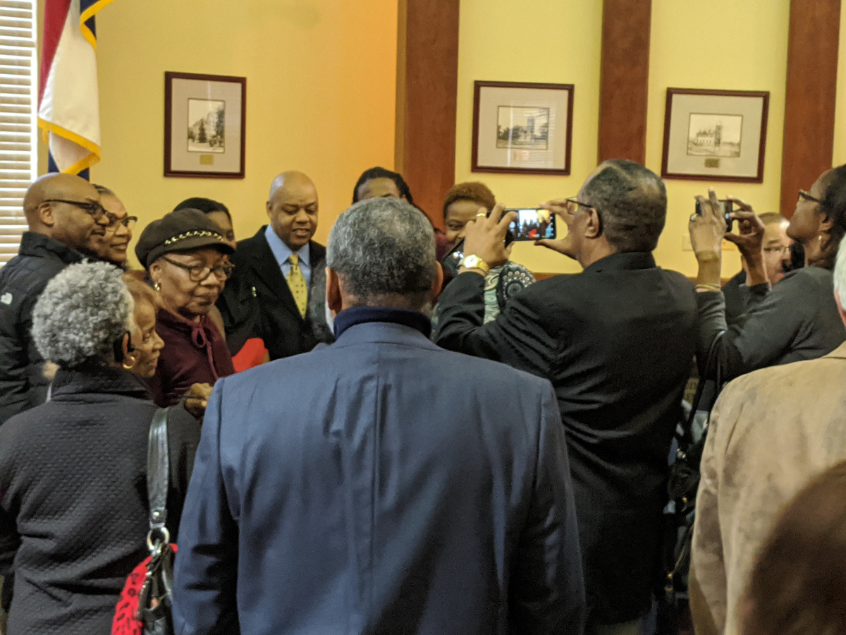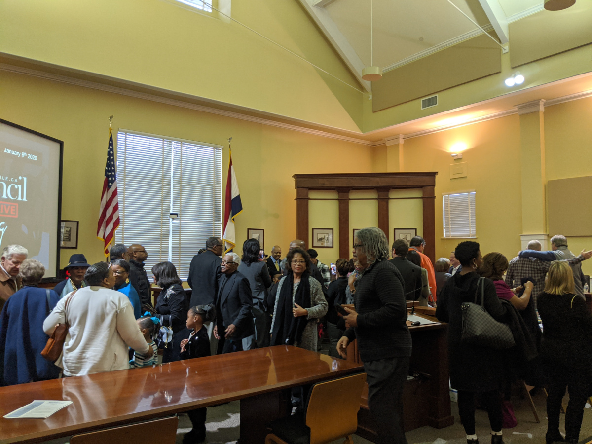 Congratulations to Mayor Ed Johnson and to Councilmen Darryl Langford and Joe Clark for winning their elections and leading our Blue Wave for Fayette County. Mayor Johnson and Councilmen Langford & Clark were sworn in on January 9, 2020, at the Fayetteville City Council Ceremony prior to the general council meeting. Many members of FDW and FCDC were in attendance to share in the excitement of this historic occasion. The hard work of many of our communities to make phone calls, knock on doors, wave signs, and financially support their campaigns paid off with the victories for these three distinguished individuals. There were so many enthusiastic families, friends, and constituents of these elected officials, it was hard to get the room cleared for the regular city council meeting to convene. Our presence was noted and joy of victory was clear.