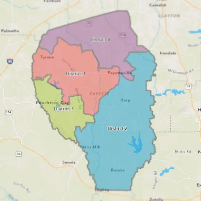 Fayette County is split into four equally proportioned County Board of Commissioners and School Board Districts. Each District elects one member to both boards, and a 5th board member is elected from a county-wide “At-Large” District.